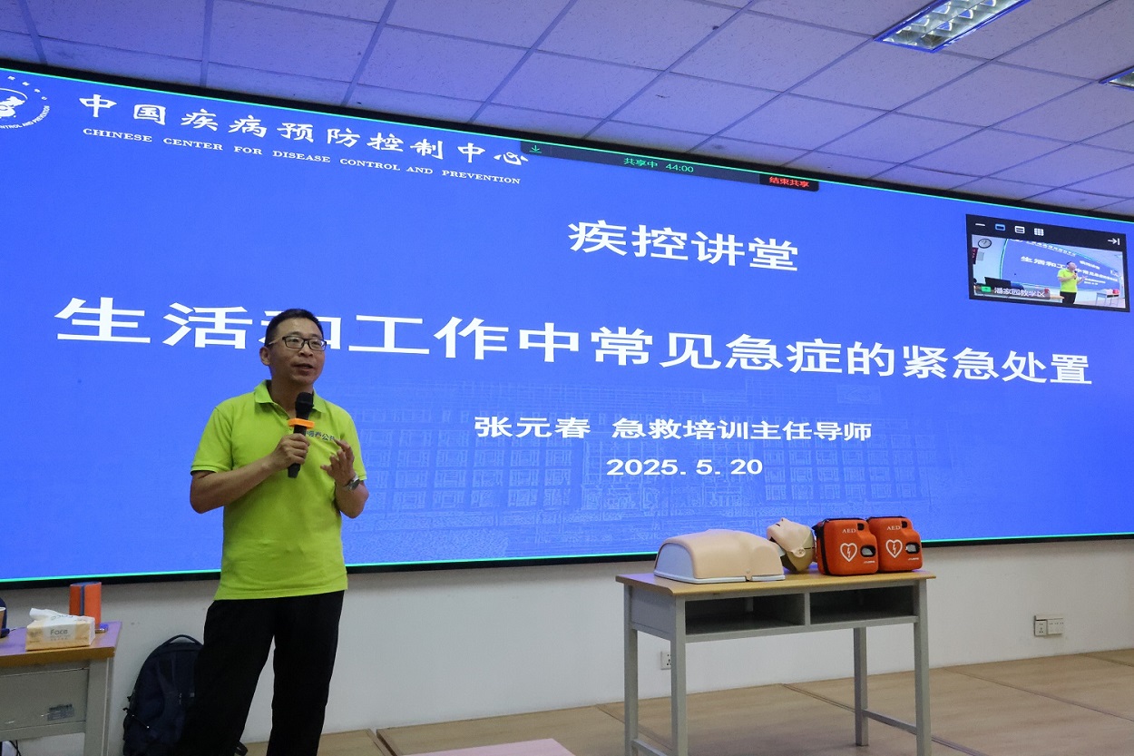 下午,急救专家张元春老师以“生活和工作中常见急症的紧急处置”为主题授课。张老师结合多个真实且发人深省的案例,细致讲授了大出血、骨折、气道异物、心脏骤停等急症的处置方法,重点讲解并示范了心肺复苏术(CPR)规范步骤,同时,现场演示AED(自动体外除颤器)使用方法,强调其关键作用及操作安全事项。