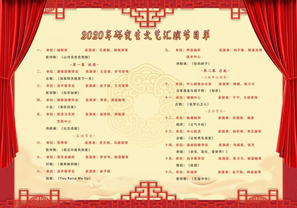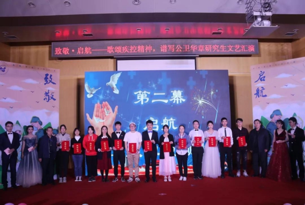 2020年10月21日,在中心领导、中心研究生院领导、中心团委的关心和指导下,中国疾病预防控制中心研究生会主办,各培养单位研究生会协办的“致敬·启航——歌颂疾控精神,谱写公卫华章”中心研究生文艺汇演,在中心北区综合楼二层报告厅隆重举行。莅临汇演的领导和老师有中心研究生院副院长、中心教育培训处处长罗会明老师,中心研究生院副院长、中心运管中心主任谭吉宾老师,中心群团处处长项春老师,中心教育培训处副处长戴政老师以及中心团委书记韩璐老师。中心研究生会还特邀北京协和医学院研究生会成员,中国工程物理研究院研究生会成员,铁科院研修学院学生会主席等同道学友参加活动。